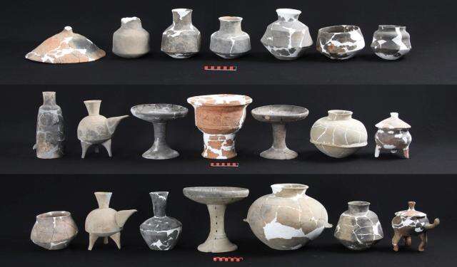 在寺墩第六次发掘出的文物中,陶器占据重要一席。它们大致分为早晚两期,不少随葬陶器是实用器,炊具、餐具、酒水器等,一应俱全。“在所有出土器物中,陶鬶数量比较多,而且非常有特色。”南京博物院寺墩遗址考古发掘项目负责人于成龙说。