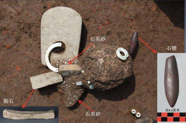 “崧泽王”墓中,有一件通体紫红的石锥最引人瞩目。这件石锥出土时放置在墓主人的头部,旁边还散布着一件砺石和许多石英砂。考古队推测,这是一套琢玉工具,而这些文物的出土,也表明“崧泽王”拥有治玉权。在松泽文化时期,这是财富和身份的象征。
