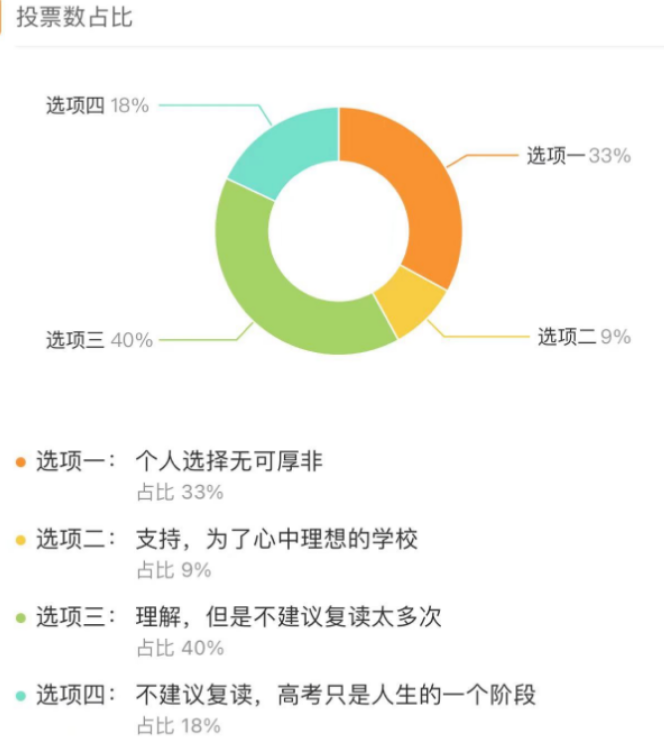 在媒体发布的投票中,多数网友理解唐尚珺的遭遇,认为复不复读都是个人选择无可厚非,也有网友表示,高考只是人生的一个阶段,不建议复读。