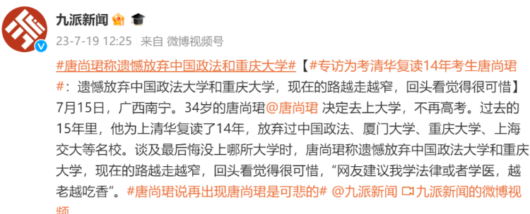 这些年,唐尚珺曾相继被中国政法大学、厦门大学、广西大学、重庆大学等知名高校录取,他都没有去读。2022年,唐尚珺考了597分,被上海交大护理专业录取,身边的家人、朋友都劝他去读。最终,他还是犹豫了,没有去报到。他觉得专业不合适,且这次高考发挥失常,“虽然(明年)清北不一定考得上,但有信心考得比今年好”。