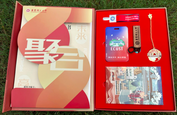 华理副校长王慧锋对2023年本科新生录取通知书的设计理念和内容进行了介绍。该校2023年录取通知书以“聚合”为主题,用分子的聚合象征华理以化工、化学、材料等为特色优势学科,体现出华理文理交融、多学科协调发展的办学特色,寓意期待每一位新生成为华理大家庭的一“分”子。礼盒内部还装有华理师生设计的文创周边,包括金属书签、卡套、檀木印章等。手绘华理建筑明信片使校园于朵朵浪花中巍峨而立,寓意学子在华理乘风破浪、扬帆起航。