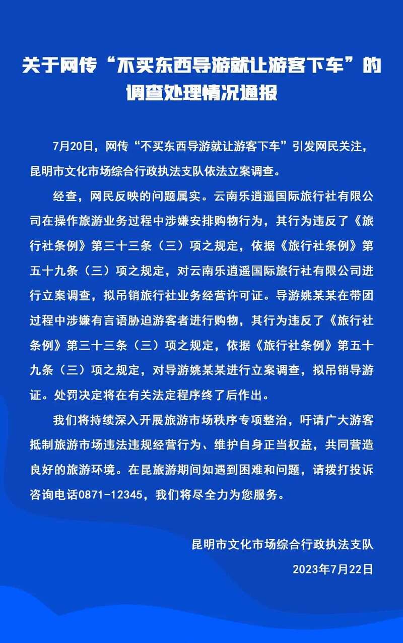 7月22日,昆明文旅微信公众号发布关于网传“不买东西导游就让游客下车”的调查处理情况通报