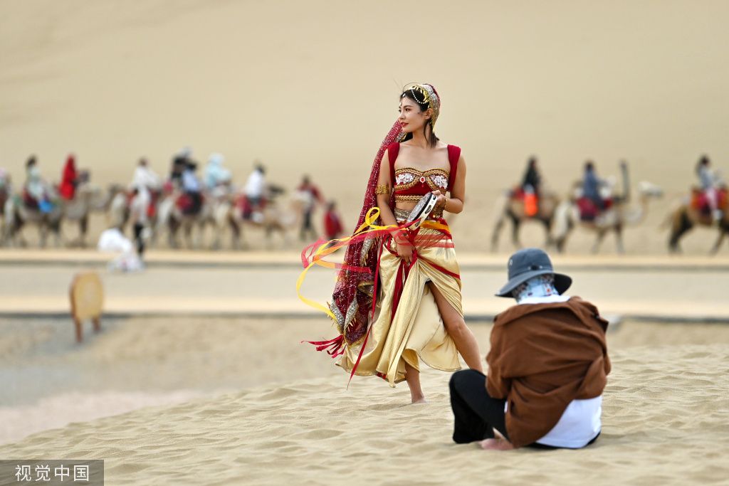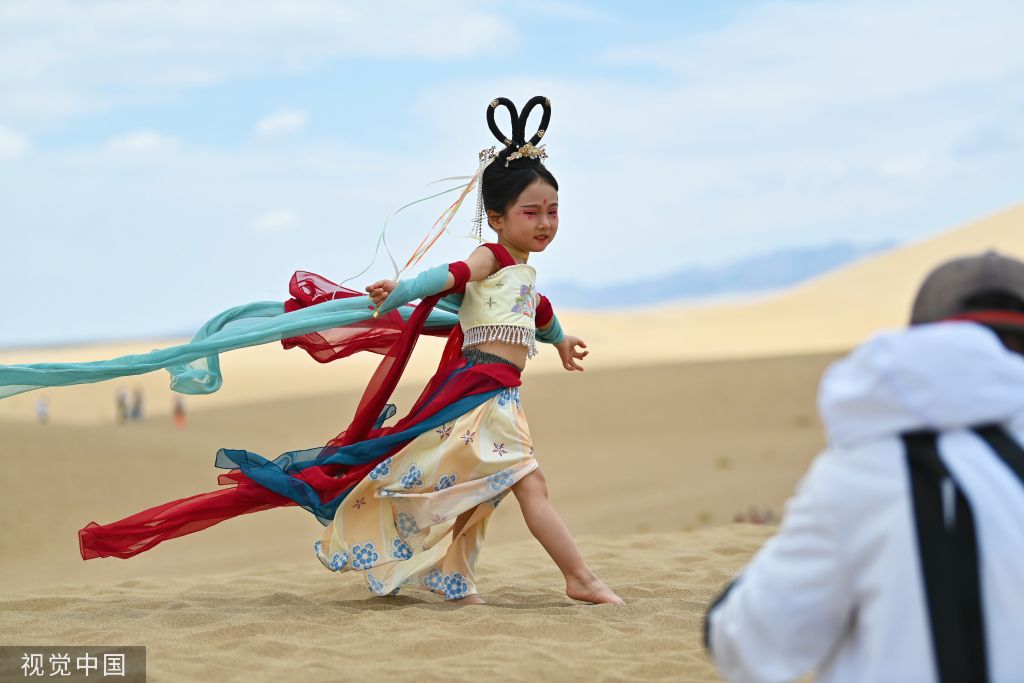 2023年7月21日,甘肃酒泉,敦煌鸣沙山月牙泉景区内,游客身着飞天服饰进行旅拍。随着有关敦煌舞的综艺节目和网络直播持续走红,不少游客前往敦煌景区穿上以飞天服饰为代表的各类服装进行打卡拍照。以“飞天旅拍”为代表的敦煌元素,为游客提供了一种独特的旅行体验。据了解,2023年敦煌涌现出近百家“旅拍店”,除了主打代表敦煌文化的飞天服饰外,还新增了西域公主等具有浓郁西域风格的服饰。 中新社记者 李亚龙 摄