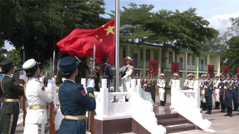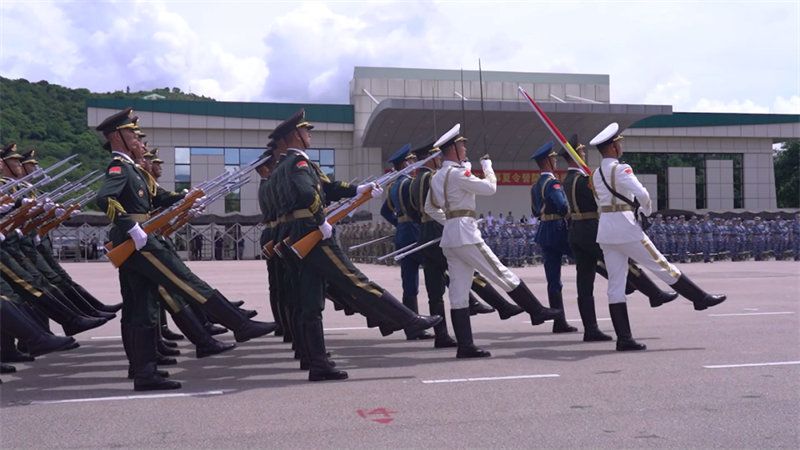 上午10时30分,驻香港部队三军仪仗队步履铿锵、昂首阔步护旗而出,在雄壮的国歌声中,五星红旗冉冉升起,青少年们庄严肃立,与解放军官兵一起高唱国歌。