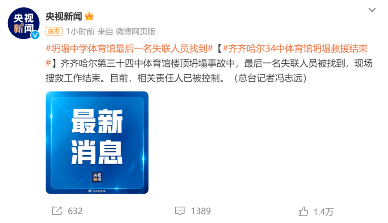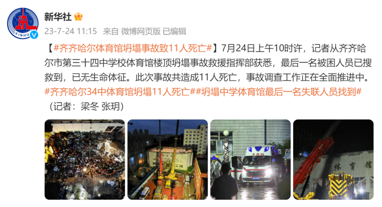 据新华社报道,7月24日上午10时许,记者从齐齐哈尔市第三十四中学校体育馆楼顶坍塌事故救援指挥部获悉,最后一名被困人员已搜救到,已无生命体征。此次事故共造成11人死亡,事故调查工作正在全面推进中。