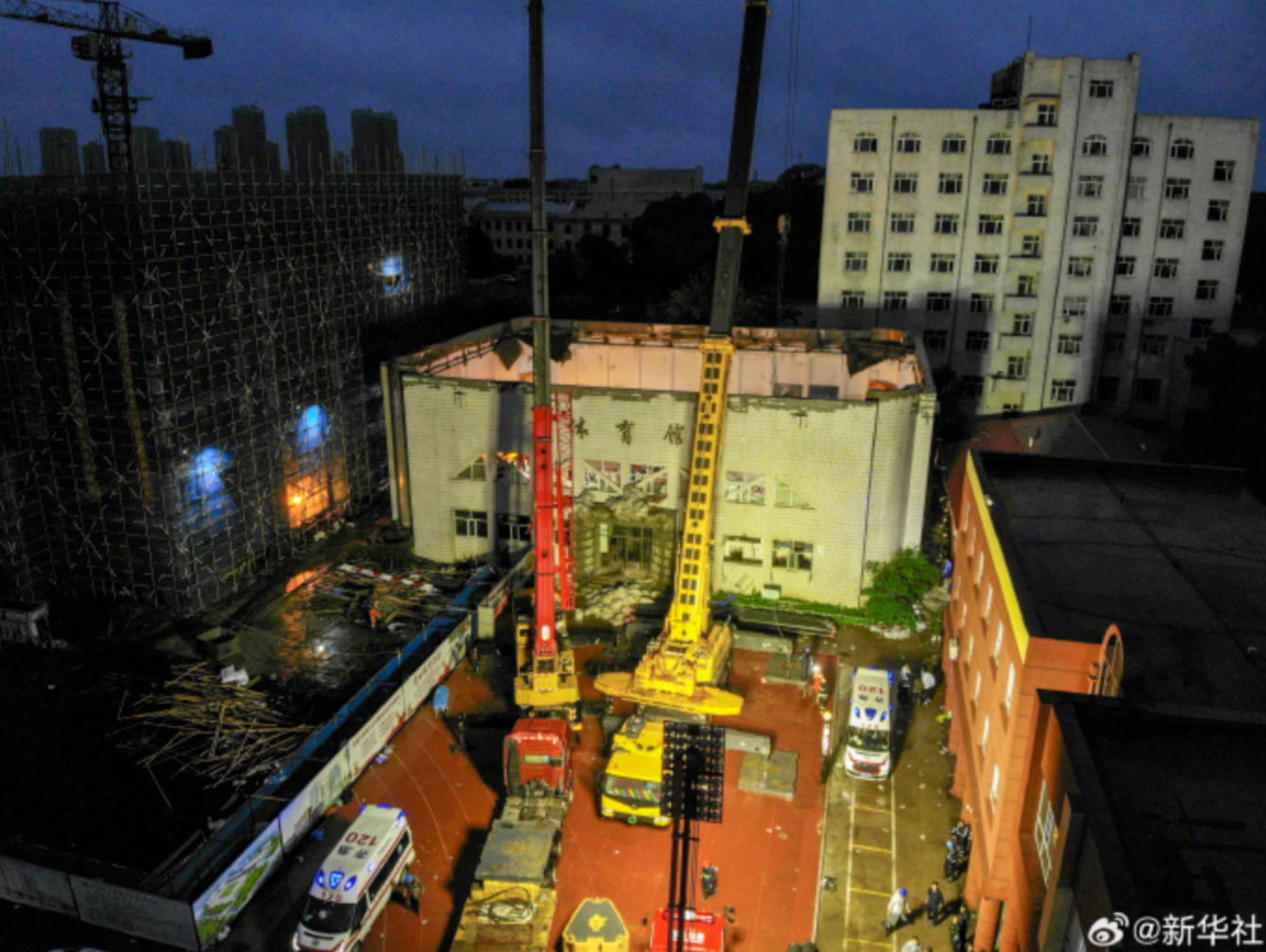 经现场初步调查,与体育馆毗邻的教学综合楼施工过程中,施工单位违规将珍珠岩堆置体育馆屋顶。受降雨影响,珍珠岩浸水增重,导致屋顶荷载增大引发坍塌。深入调查仍在进行中。目前,教学综合楼施工单位责任人已被公安机关控制。