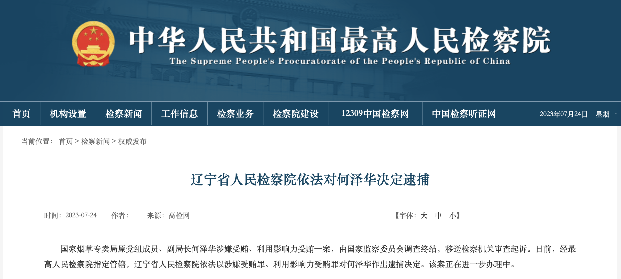国家烟草专卖局原党组成员、副局长何泽华涉嫌受贿、利用影响力受贿一案,由国家监察委员会调查终结,移送检察机关审查起诉。日前,经最高人民检察院指定管辖,辽宁省人民检察院依法以涉嫌受贿罪、利用影响力受贿罪对何泽华作出逮捕决定。该案正在进一步办理中。