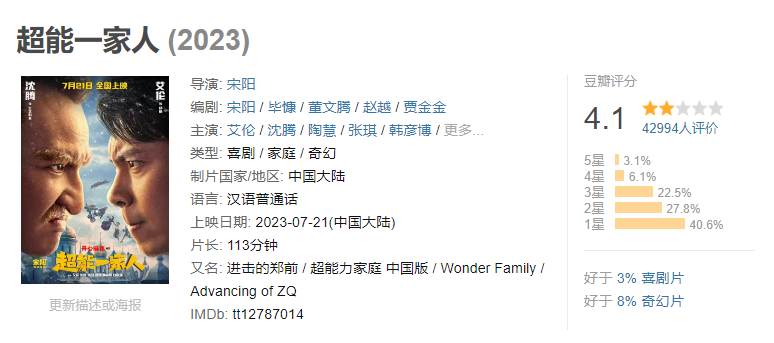 《超能一家人》豆瓣开分4分,截至北京时间7月24日10时,豆瓣评分略微上升到4.1分