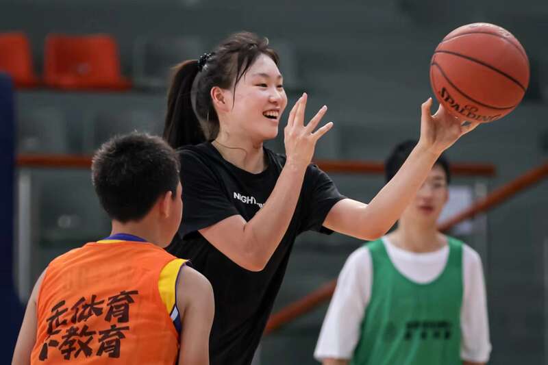 首届蔡崇信篮球奖学金获得者王芙蕖(中)与喜爱篮球运动的少年一起打球。徐峻杰/摄