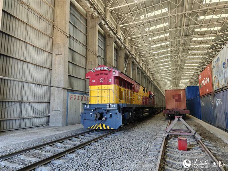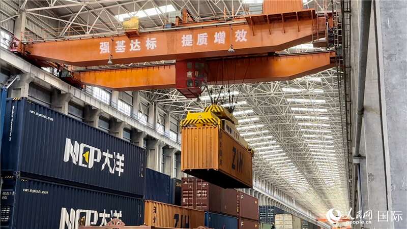 换装完毕的中欧班列即将从换装库内驶出。人民网记者 刘洁妍摄