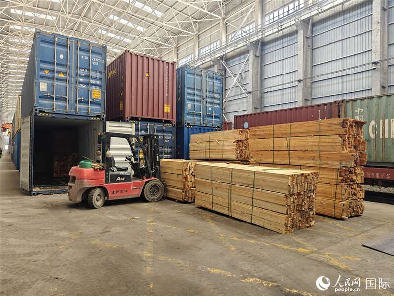 阿拉山口站换装库内,进口木材被卸下等待海关查验。人民网记者 刘洁妍摄