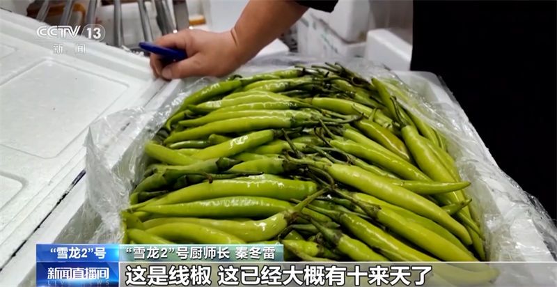 “雪龙2”号厨师长 秦冬雷:从叶子菜到土豆、洋葱、胡萝卜、冬瓜之类的,这里都有。最起码有二三十种蔬菜。到了后期,会少一点。这是线椒,这已经大概有十多天了,保存还是不错的,你看一个都不坏,很新鲜的。