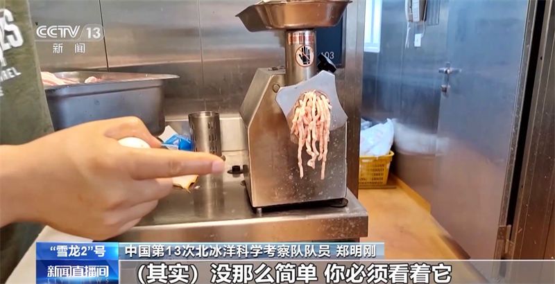 中国第13次北冰洋科学考察队队员 郑明刚:我在绞肉。在家没绞过肉,这东西没用过,刚才师傅还教了怎么用。我原来以为很简单,其实没那么简单,你必须看着它,全部绞干净了,才能放。就和人一样,吃多了容易积食。帮一天厨,学不少东西,挺好。