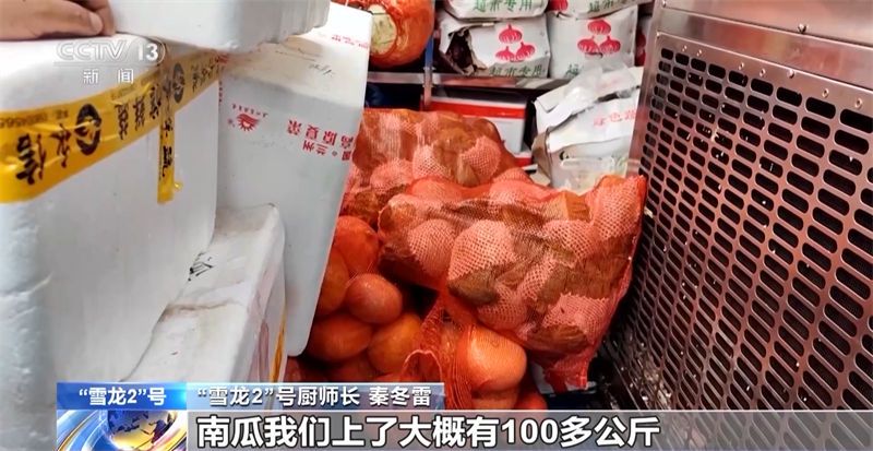 “雪龙2”号厨师长 秦冬雷:西红柿,我们一般出来带大概150到200公斤左右,因为存放时间也不长,只能吃上几顿。南瓜我们上了大概有100多公斤。整个的食物估计3吨蔬菜是有的。