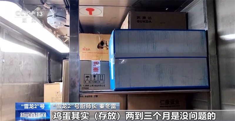 “雪龙2”号厨师长 秦冬雷:这是我们的蛋品库,我们这个航程100号人,我买了一万出头一点点。按个算的,平均一个人每天都能有一个白煮蛋,我们七八十天航程,就是七八千个,还有一些做成菜,蛋糕之类的,已经吃了十多箱了。鸡蛋其实存放两到三个月是没问题的。