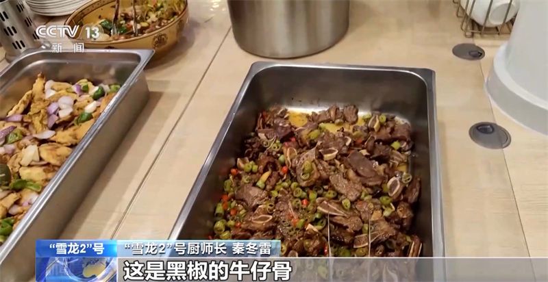 “雪龙2”号厨师长 秦冬雷:有一个香酥的鱼,炸的鱼块,这是黑椒的牛仔骨,拌的黄瓜,炒了一个香菇青菜,我们的主食今天晚上是白米饭加意大利面,还有水果。