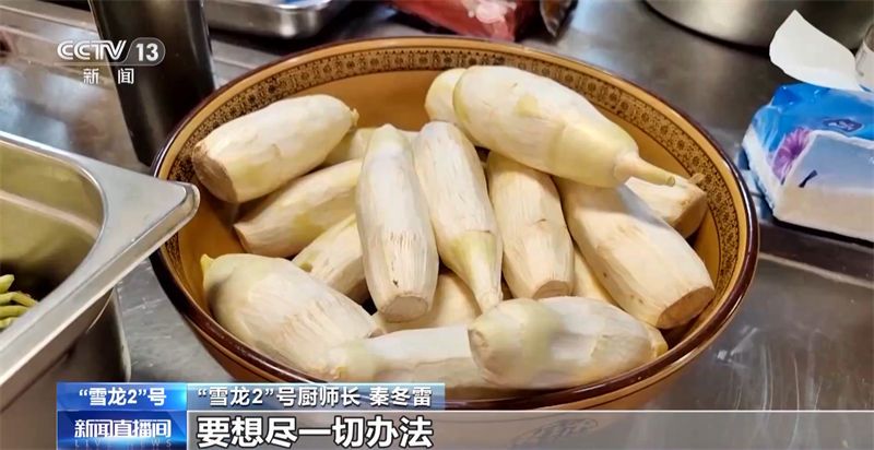 “雪龙2”号厨师长 秦冬雷:吃饭压力一开始是不大,到了后期,没有新鲜蔬菜了,就有点压力了。后期除了大白菜、土豆、洋葱这种的,其它都没有了。山药有的。要想尽一切办法,帮他们做点豆腐,发点豆芽,这种相对来讲比较新鲜一点的。