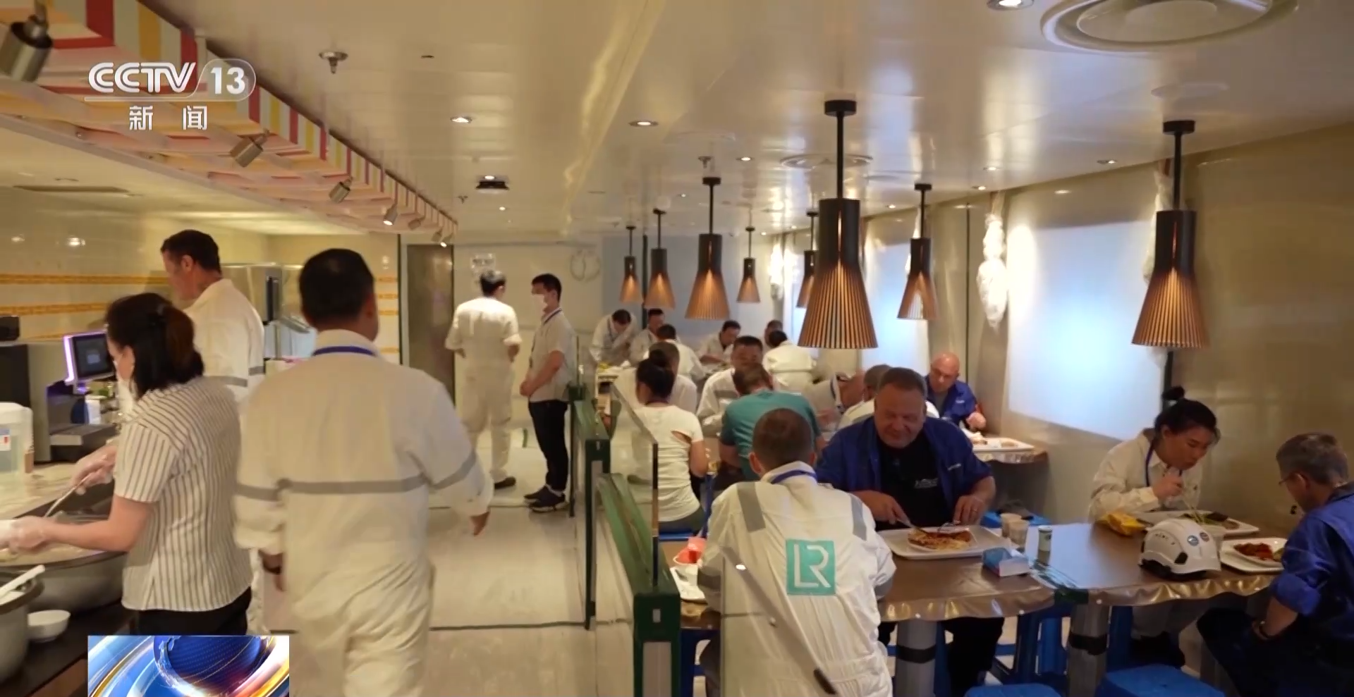 总台央视记者 吴天白:我们现在来到了试航工作人员就餐的位置,也就是船员餐厅。因为船上的工作人员一共有1200多位,但餐位只有400个,所以就餐的时间不一样,一些岗位要尽快吃完饭回到岗位上继续工作。