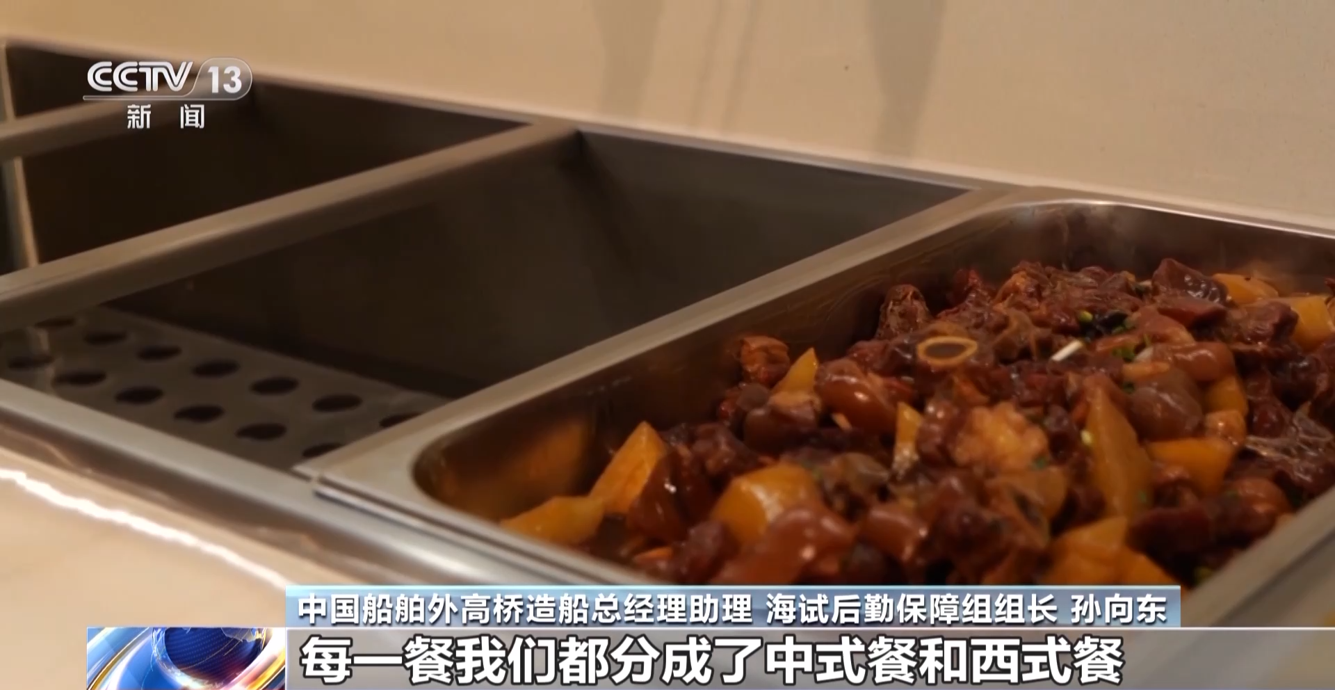 中国船舶外高桥造船总经理助理 海试后勤保障组组长 孙向东:这次试航每一天的菜单,我们事先都排好了。品种比较丰富,每一餐我们都分成了中式餐和西式餐。