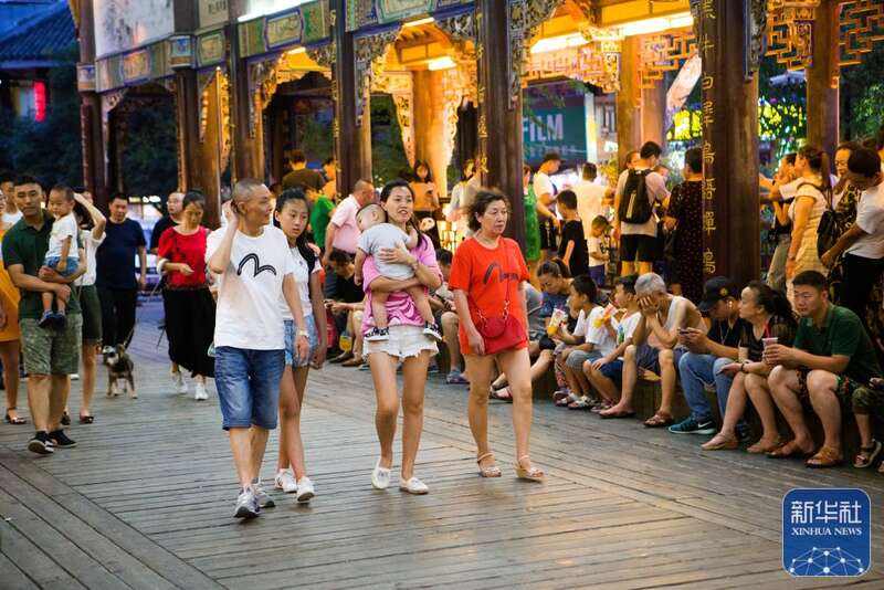 ↑市民游客在都江堰市南桥里休憩(6月24日摄)。新华社发(何勃摄)