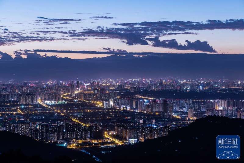 ↑从东一环俯瞰夜幕下的成都市中心(7月18日摄)。新华社发(廖铁军摄)