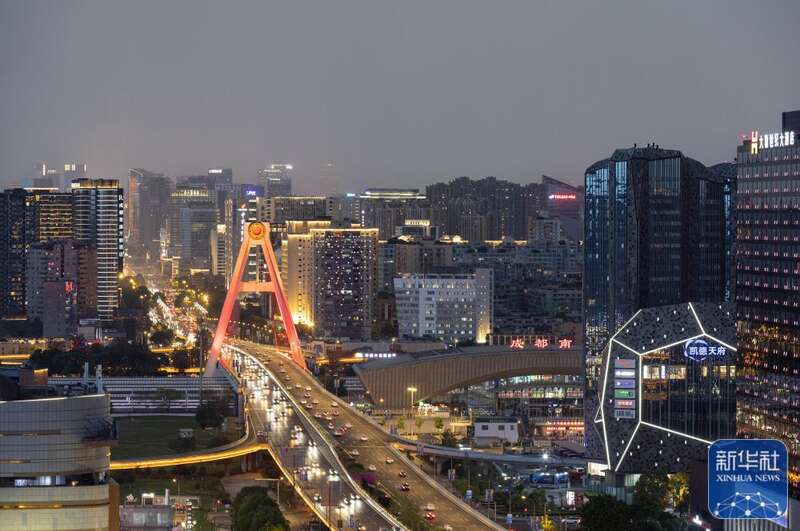 ↑夜幕下的成都高新区一角(7月9日摄)。新华社发(王琦摄)