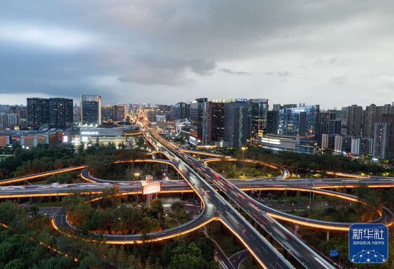 ↑夜幕下的成都市人民南路立交桥(7月25日摄)。新华社记者 江宏景 摄
