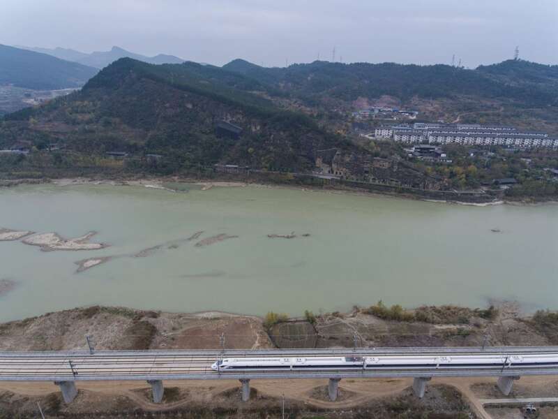 2017年12月6日,D4254次列车通过位于广元市北郊的西成高铁嘉陵江特大桥。列车行驶在嘉陵江西岸,东岸是始于北魏、兴于唐和五代的千佛崖摩崖石刻。新华社记者 江宏景 摄