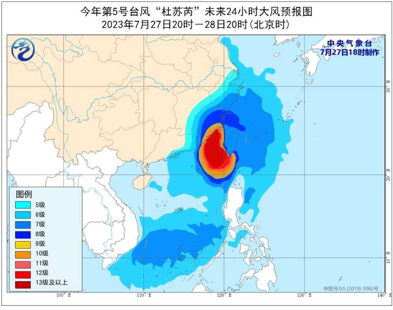 7月27日17时,“杜苏芮”的中心距离福建省厦门市南偏东方向约360公里,中心附近最大风力16级(52米/秒,超强台风级)。预计“杜苏芮”28日早晨到上午在福建东山到莆田一带沿海登陆,登陆时强度为强台风级或超强台风级(48米至55米/秒,15至16级)。