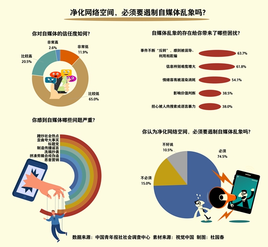 调查显示,净化网络空间,74.5%的受访者认为必须要遏制自媒体乱象。