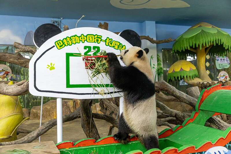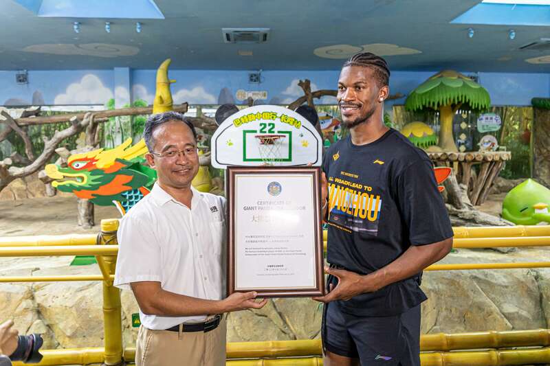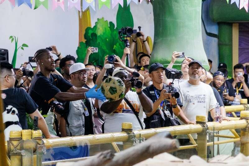 现场,吉米·巴特勒手捧特制的竹制篮球与大熊猫三胞胎的帅帅互动,他在场外将球精准投入场内的特制篮框中。今年7月29日,大熊猫三胞胎萌萌、帅帅、酷酷将迎来它们9周岁生日,巴特勒为此录制了一段视频,为三胞胎送上生日祝福,并接受了“长隆‘超级大熊猫节’——大熊猫宣传大使”的授予称号。他表示,见到大熊猫三胞胎非常开心,感受到了超乎想象的快乐。