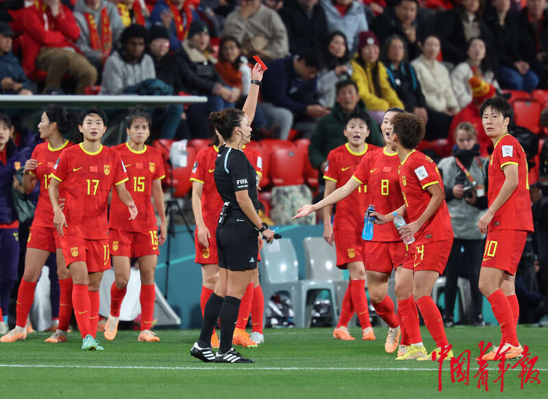 7月28日,澳大利亚阿德莱德市欣德马什体育场,2023女足世界杯D小组的第二场比赛中,中国队10号(右一)踢人犯规,被红牌罚下。刘占崑/摄