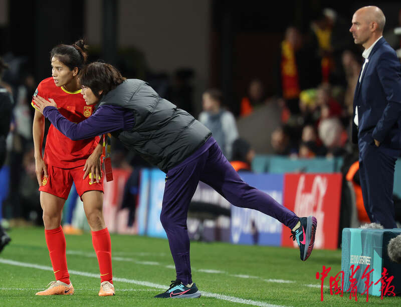 7月28日,澳大利亚阿德莱德市欣德马什体育场,2023女足世界杯D小组的第二场比赛中,中国队主教练水庆霞(中)为15号队员陈巧珠指导。刘占崑/摄