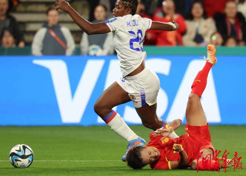 7月28日,澳大利亚阿德莱德市欣德马什体育场,2023女足世界杯D小组的第二场比赛中,中国队19号张琳艳被对方防守队员拉扯。刘占崑/摄