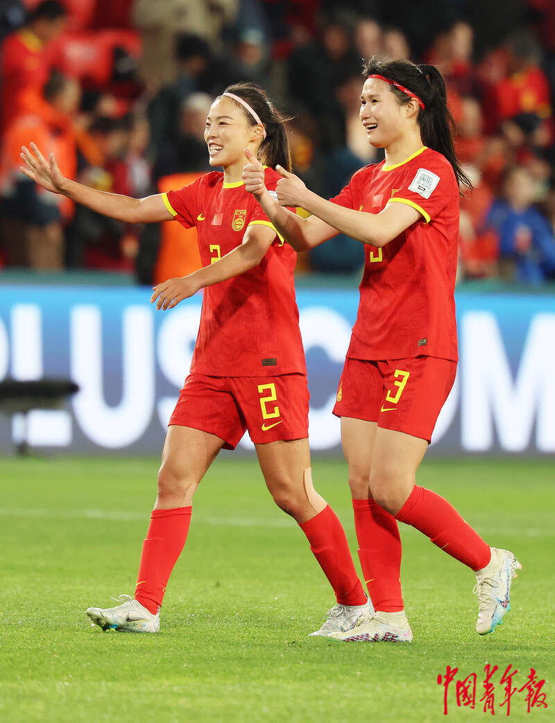 7月28日,澳大利亚阿德莱德市欣德马什体育场,2023女足世界杯D小组的第二场比赛中,中国队获胜,2号李梦雯和3号窦加星开心庆祝。刘占崑/摄