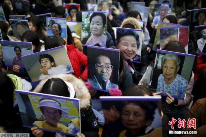 资料图:2015年12月30日,韩国首尔,当地民众手中高举慰安妇的照片,在日本使馆前集会抗议。