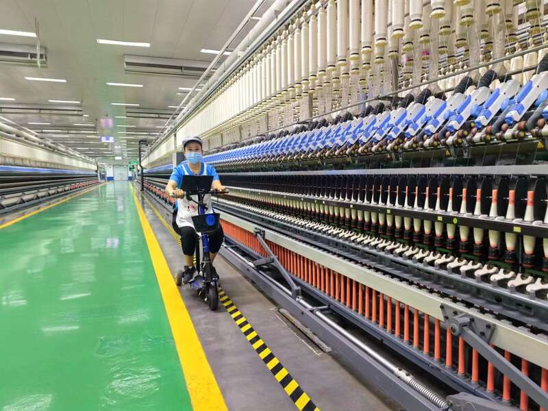纱锭飞转,将一道道肉眼难见的细纱纺成纱锭。几名女工骑着电动车穿行其间,伸手轻轻一勾,将断纱接上。