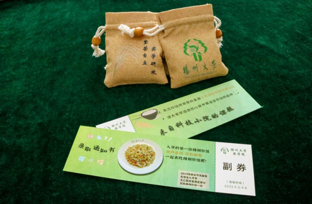 近日,扬州大学农学院录取通知书寄出。随通知书一同送出的还有一份装有大米的小布袋与扬州炒饭兑换券。