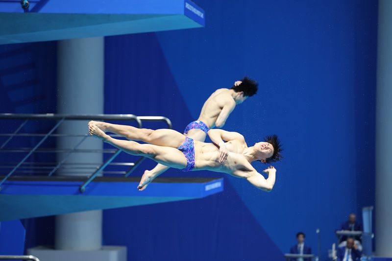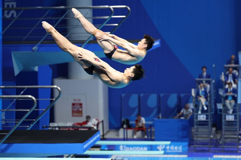 7月31日,四川成都,成都大运会跳水比赛开始首个比赛日,在下午进行的男子双人3米板决赛中,中国组合黄博文/梁朝辉力克实力强劲的德国选手,勇夺金牌。这是成都大运会跳水项目的首枚金牌。中青报•中青网记者 曲俊燕 文并摄