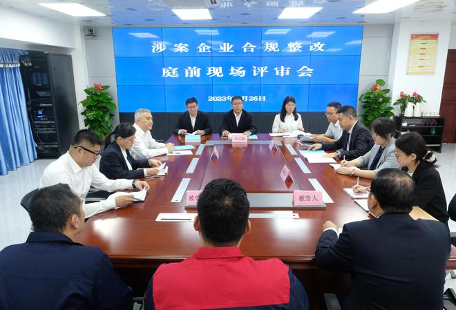 4月26日,合议庭在该企业召开合规整改庭前现场评审会,合议庭与公诉人,评审专家、被告人、被告单位诉讼代表人及辩护人六方参会。