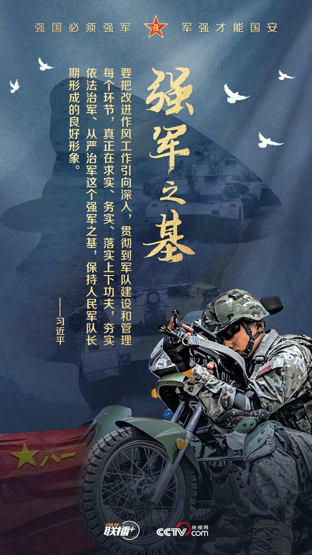党的十八大以来,习近平主席始终高度重视国防和军队建设,为全军擘画强军兴军蓝图、指引奋进方向。值此中国人民解放军建军96周年之际,央视网《联播+》栏目制作强军海报,与您一起学习习主席的强军思想。