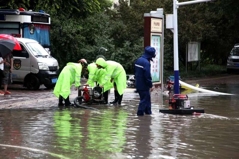 石家庄行唐县消防救援大队工作人员用水泵清理积水。