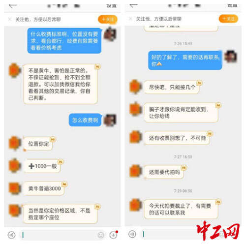 中工网记者在社交媒体上发布了寻找门票代抢的相关帖子,立即有网友自称可以帮忙有偿代抢,但要求是不替客户垫钱且支付1000元代抢费,如果没有抢到可以全额退款。在中工网记者表示犹豫时,该网友则提醒名额有限,需要尽快决定。