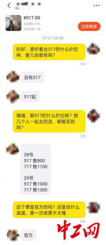 当中工网记者询问薛之谦深圳站演唱会门票的价格时,对方表示,“原价517元的位置售价800元或1000元,原价717元的位置售价1100元或1300元”。另一名出售多张张杰长沙站演唱会门票的卖家则表示,原价580元的单张票,售价1800两张。两名卖家均承诺,售卖的门票是官方票。