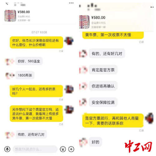 中工网记者向卖家询问张杰演唱会票价情况的截图