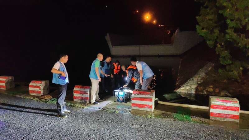 8月1日,十三陵水库管理处水环境管理所组织人员连夜抽排消力池积水点。受访者供图