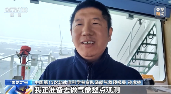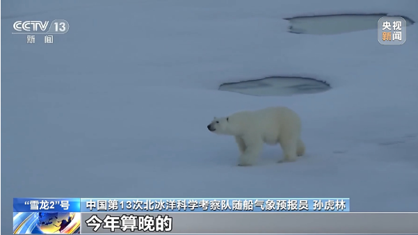 中国第13次北冰洋科学考察队随船气象预报员 孙虎林:以往几次(北极科考)刚进冰区第一天或者第二天就遇到了(北极熊),今年算晚的,今年我们已经在冰区里七八天了。
