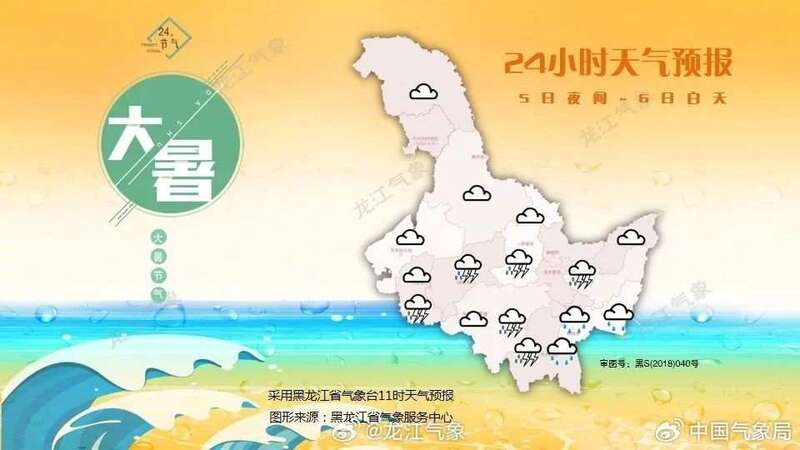 其中,5日伊春南部、绥化东北部、哈尔滨北部、鸡西、牡丹江东北部有短时强降水、雷雨大风、小冰雹等强对流天气,最大小时雨量20~40毫米,阵风7~8级。