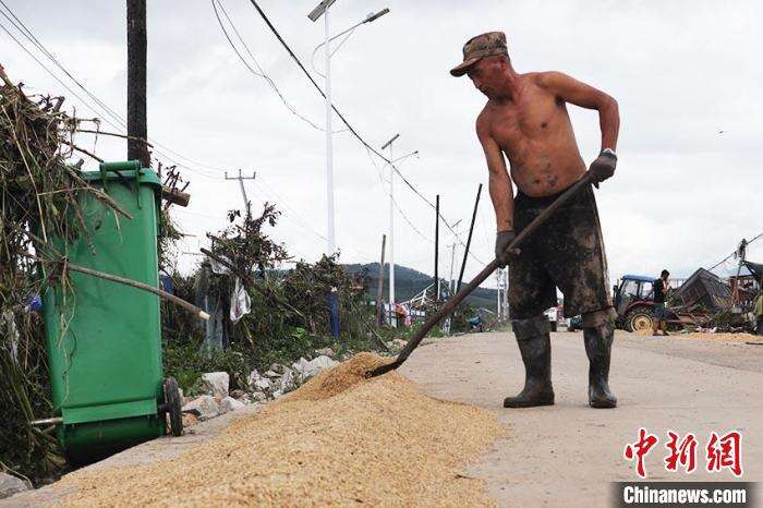 64岁的村民谢正国正将泡过水的稻粒铺开晾晒,忙出一身汗。“能抢下来什么就抢什么。”谢正国无暇休息,晒完粮食,他还要回家清淤。