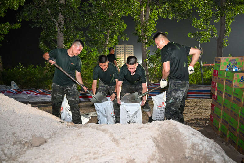 ↑8月4日,武警天津总队官兵在大清河天津静海段南堤上进行岸堤加固作业。